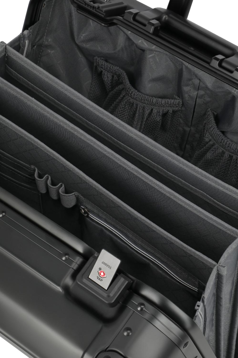Binnenin vind je een volledig gevoerd interieur met slimme organisatieopties. De trolley beschikt over 3 interne steekvakken, een uitneembaar opbergvak met ritssluiting en een veilig 15.6" laptopvak, zodat al je zakelijke essentials overzichtelijk en snel bereikbaar zijn.