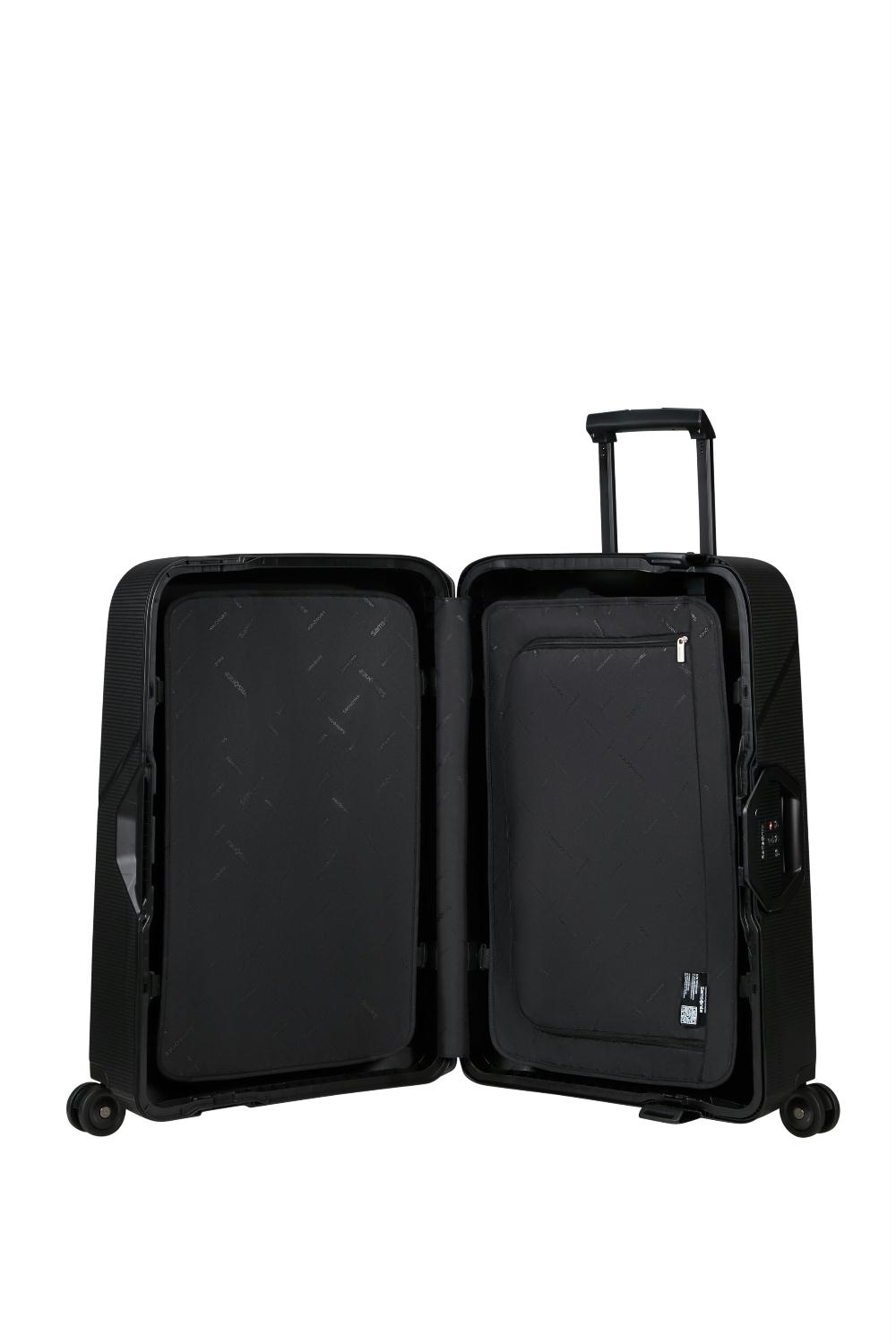 De Samsonite Magnum Eco Spinner 69cm (KH2*002 18 GRAPHITE) is comfortabel te vervoeren dankzij een dubbele trekstang en 4 roterende wielen. Comfort is gecombineerd met een praktisch design en zorgvuldige afwerking. Het ruime hoofdcompartiment is voorzien van een afsluitbaar ritscompartiment. De binnenvoering is te verwijderen, waardoor zowel de binnen voering als de koffer gemakkelijk schoon is te maken. Daarnaast zorgt een TSA-cijferslot ervoor dat de bagage veilig is opgeborgen.